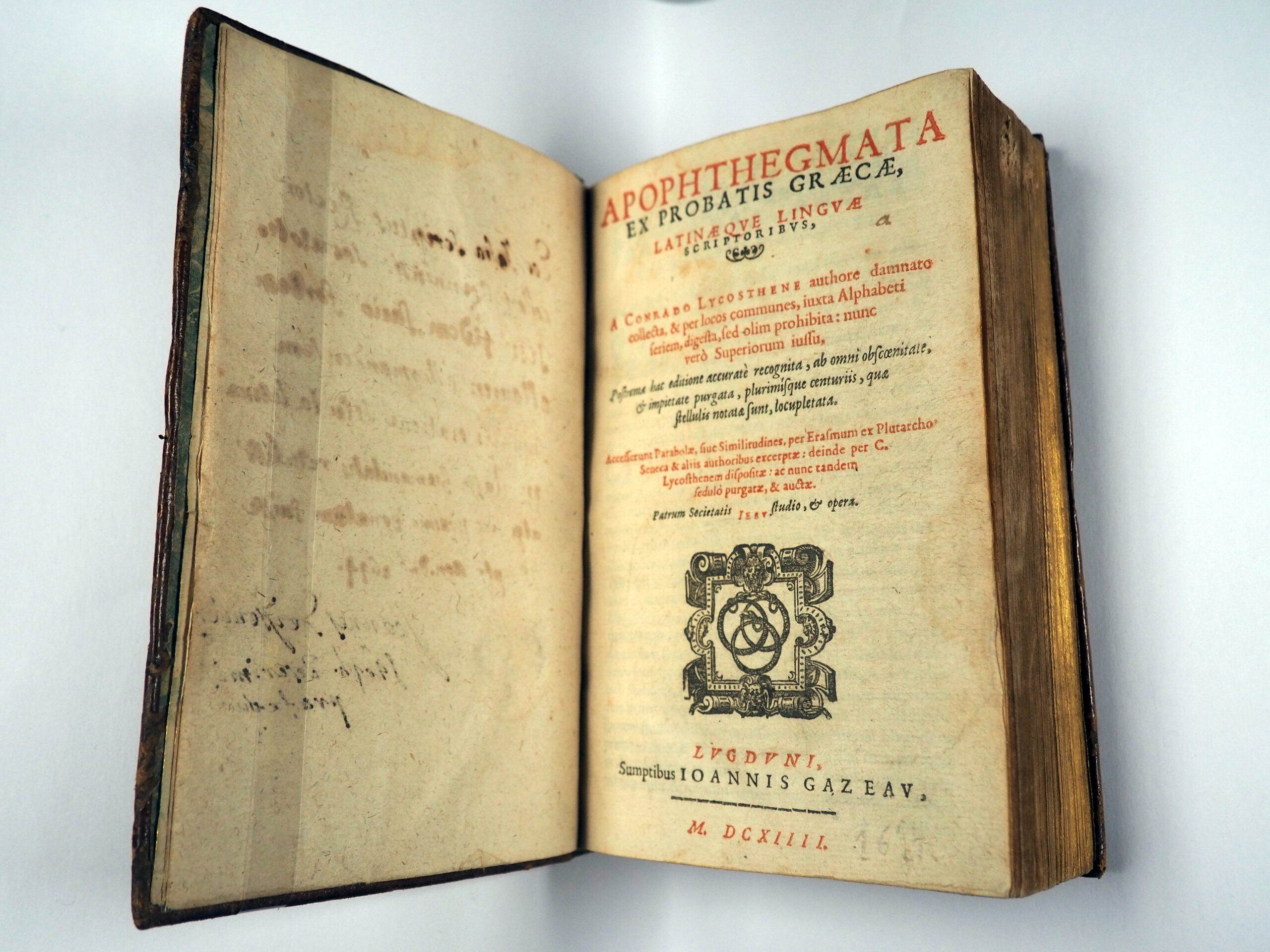 Desiderius Erasmus, Parabolae sive similitudines, per Erasmum ex Plutarcho, Seneca & aliis authoribus excerptae […] purgatae & auctae. Lyon, J. Gazeau, 1614.