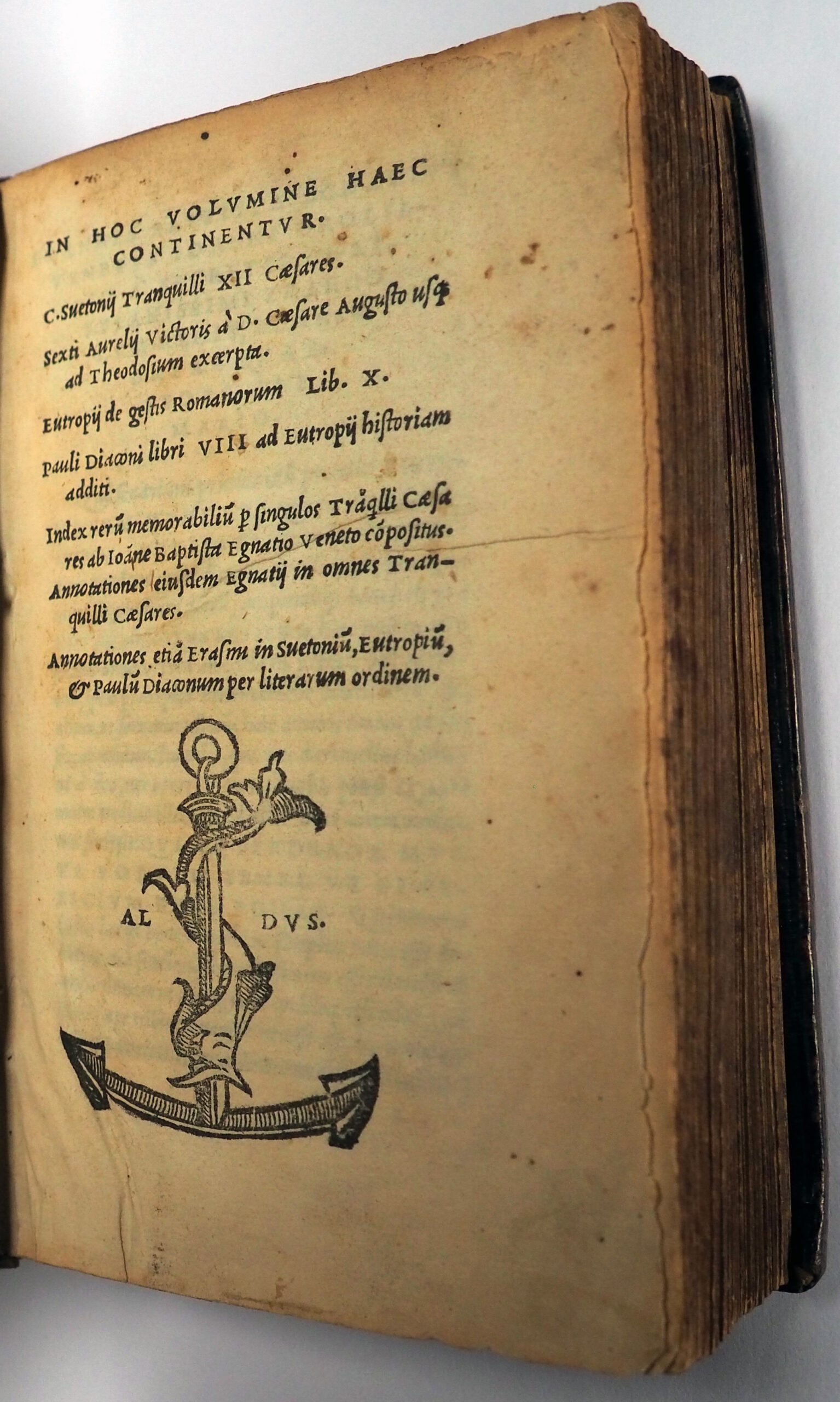 Desiderius Erasmus (ed.), Suetonii XII Caesares ; Eutropii De gestis Romanorum ; Pauli Diaconi libri VIII ad Eutropii historiam (…) ; Annotationes Erasmi, Venetië, erfgenamen van Aldus Manutius, 1521. Coll. MEH E 1608.